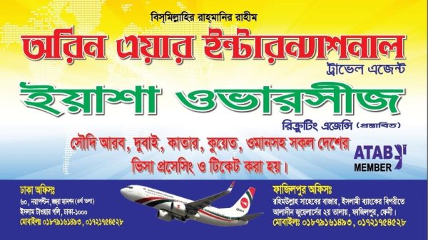 গ্রাহক সেবার অঙ্গীকার নিয়ে ফাজিলপুরে শীঘ্রই শুভ উদ্ভোদন হতে যাচ্ছে “অরিন এয়ার ইন্টারন্যাশনাল এন্ড ইয়াশা ওভারসীজ”