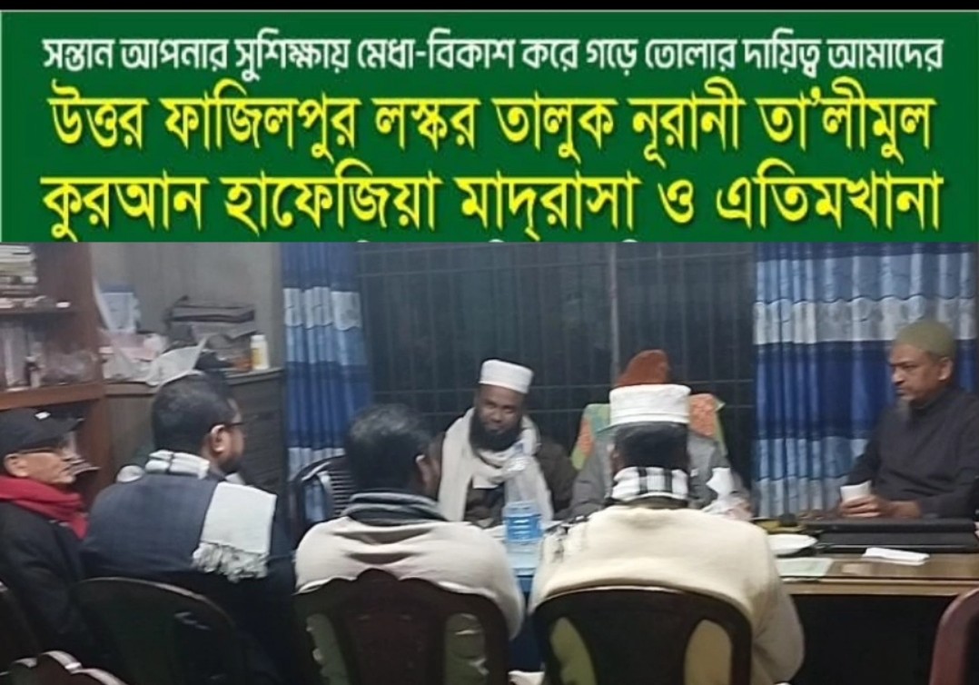 উত্তর ফাজিলপুর লস্করতালুক নূরানী তালিমুল কুরআন হাফেজিয়া মাদ্রাসা ও এতিমখানার উন্নয়ন কমিটির সভা অদ্য ২৭/১২/২৪ ইং রোজ শুক্রবার বাদ মাগরিব মাদ্রাসার অফিস কক্ষে অনুষ্ঠিত হয়। অনুষ্ঠানে সভাপতিত্ব করেন মাদ্রাসার সভাপতি জনাব এরশাদ উল্লাহ রিপন। কমিটির সদস্যদের মধ্যে উপস্থিত ছিলেন জনাব মাওলানা জালাল আহাম্মদ, জনাব ফয়েজ উল্লাহ (মুহতামিম), জনাব মুর্শিদ উল্লাহ লিটন, জনাব হেদায়াত উল্লাহ, জনাব সাইফুল ইসলাম, জনাব আলা উদ্দিন, জনাব আলমগীর হোসাইন, জনাব মোঃ ইব্রাহিম, জনাব ফয়েজ উল্লাহ, জনাব তমিজ উদ্দিন চৌধুরী। সভায় আলোচ্য বিষয় ছিল আসন্ন মাহফিল আয়োজনের প্রস্তুতি, বার্ষিক পুরস্কার বিতরনী অনুষ্ঠান, বার্ষিক পরীক্ষার ফল প্রকাশ, হাফেজ ছাত্রদের পাগড়ী প্রদান, নতুন শিক্ষক নিয়োগ, হিফয বিভাগের একাডেমিক ক্যালেন্ডার তৈরি ও ৬ষ্ঠ শ্রেনীর পাঠ পরিকল্পনা।