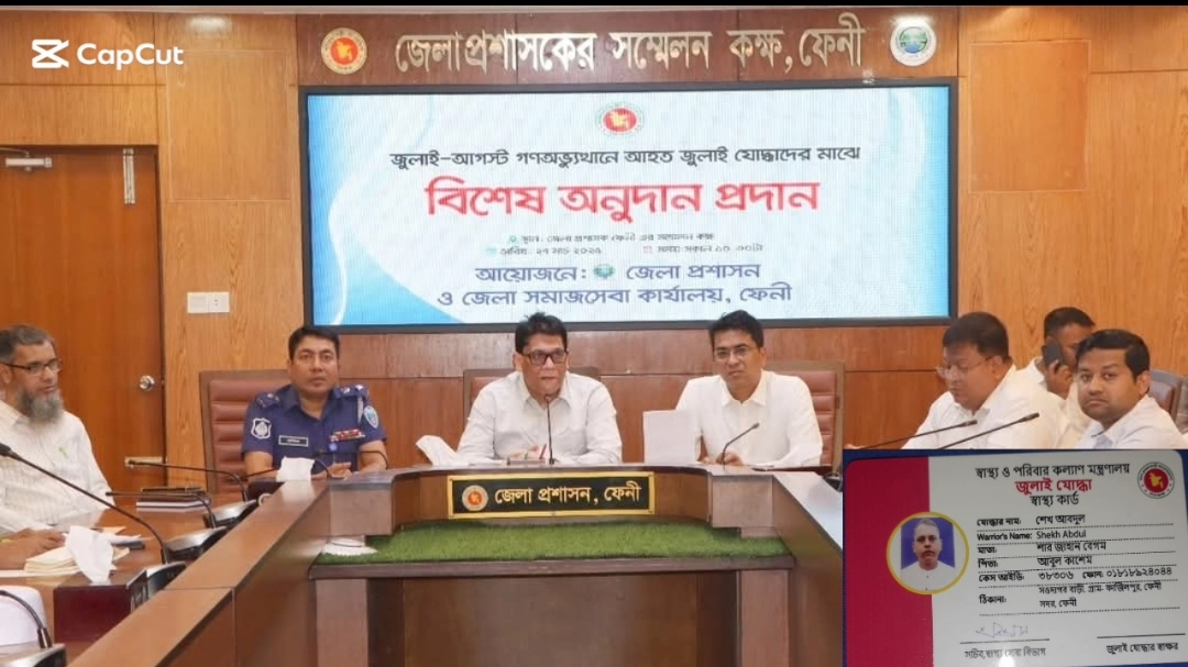 আজ ২৭ মার্চ ২০২৫ রোজ বৃহস্পতিবার ফেনী জেলা প্রশাসক এর সম্মেলন কক্ষে জুলাই-আগস্ট গণঅভ্যুত্থানে আহত জুলাই যোদ্ধাদের জেলা প্রশাসন ও জেলা সমাজসেবা কার্যালয়ের যৌথ উদ্যোগে ৫৮ জন জুলাই যোদ্ধার প্রত্যেককে ৫,০০০/- (পাঁচ হাজার) টাকা করে মোট ২,৯০,০০০/- (দুই লক্ষ নব্বই) টাকা ও হেলথ কার্ড প্রদান করা হয়।