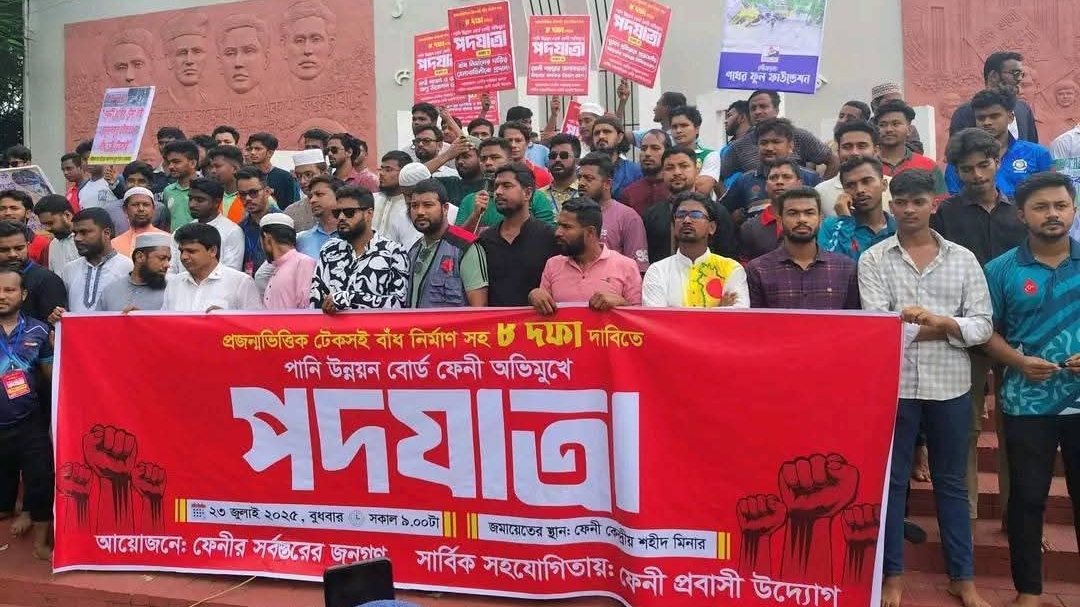ফেনীতে টেকসই বাঁধ নির্মাণ সহ ৮ দফা দাবিতে শহীদ মিনার থেকে পানি উন্নয়ন বোর্ড অভিমুখে "পদযাত্রা" আজ ২৩শে জুলাই বুধবার সকালে অনুষ্ঠিত হয়।