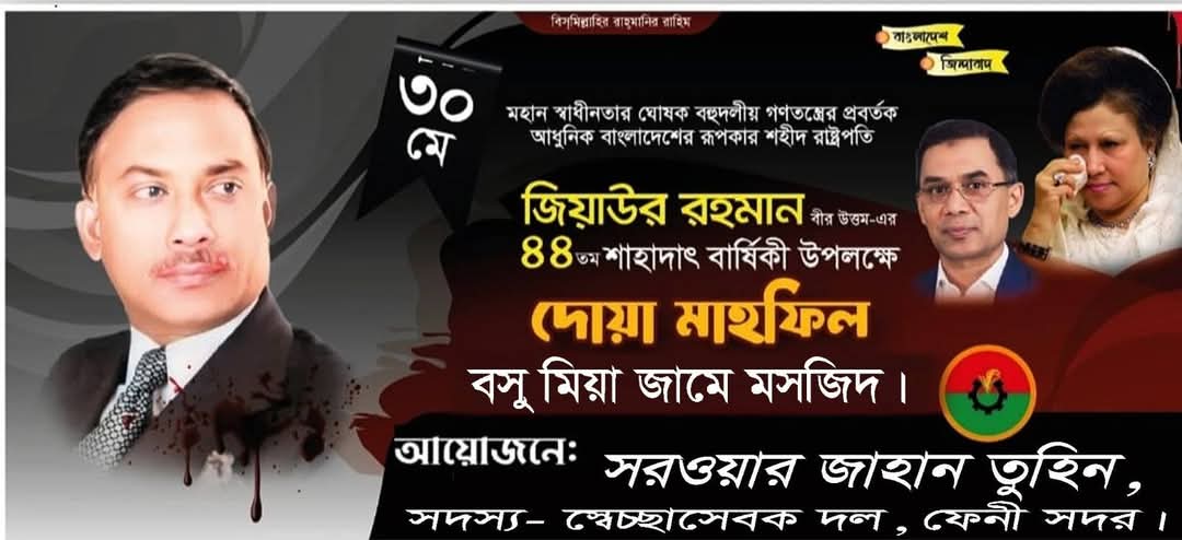 ফেনী সদর উপজেলার ফাজিলপুর ইউনিয়নের বসুমিয়া জামে মসজিদে আজ বাদ জুমা স্বাধীনতার মহান ঘোষক, বহুদলীয় গনতন্ত্রের প্রর্বতক, আধুনিক বাংলাদেশের স্থপতি "শহীদ রাষ্ট্রপতি জিয়াউর রহমান বীরউত্তম" এর আত্নার মাগফেরাত কামনা করে দোয়া মাহফিল অনুষ্ঠিত হয়। শহীদ রাষ্ট্রপতি জিয়াউর রহমান এর ৪৪তম শাহাদাত বার্ষিকী উপলক্ষে এই দোয়া মাহফিল এর আয়োজন করেন ফেনী সদর স্বেচ্ছাসেবক দলের সদস্য জনাব সরওয়ার জাহান তুহিন।