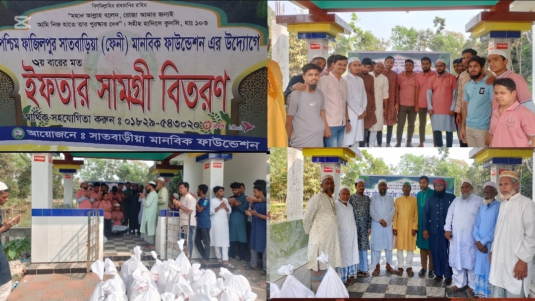 পবিত্র মাহে রমজান উপলক্ষে ২৭শে ফেব্রুয়ারি ২০২৬ শুক্রবার ফেনীর ফাজিলপুরে "সাতবাড়িয়া মানবিক ফাউন্ডেশন" সামাজিক সংগঠনের উদ্যেগে এলাকার অসহায় ও দুস্থ মানুষের মাঝে ইফতার সামগ্রী বিতরণ করা হয়েছে। মানবিক এই কর্মসূচির মাধ্যমে এলাকার নিম্নআয়ের পরিবারের হাতে ইফতার সামগ্রী তুলে দেওয়া হয়। বাদ জুমা খতিব সাহেবের দোয়ার মাধ্যমে শুরু হওয়া এই মানবিক কাজে সমাজের সনামধন্য ব্যবসায়ী ও বিশিষ্টজনেরা উপস্থিত ছিলেন।