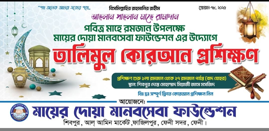 আহলান সাহলান মাহে রামাদান। পবিত্র মাহে রমজান উপলক্ষে শিবপুর আল আমিন মার্কেট "মায়ের দোয়া মানবসেবা ফাউন্ডেশন" এর উদ্যোগে মাস ব্যাপি "তালিমুল কোরআন প্রশিক্ষন" এর আয়োজন করা হয়েছে। ১ম রমজান থেকে ২৭শে রমজান পর্যন্ত প্রতিদিন বাদ যোহর এই প্রশিক্ষণ চলবে। স্থান-শিবপুর দোস্ত মোহাম্মদ মিয়াজী জামে মসজিদ (২য় তলা)। শিবপুর, আল আমিন মার্কেট, ফাজিলপুর, ফেনী।