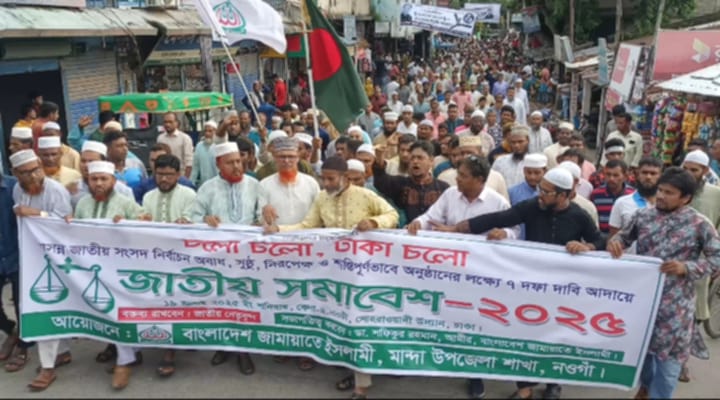 আসন্ন জাতীয় সংসদ নির্বাচন অবাধ, সুষ্ঠু, নিরপেক্ষ ও শান্তিপূর্ণভাবে অনুষ্ঠানের লক্ষ্যে ঘোষিত ৭ দফা দাবির পক্ষে এবং আগামী ১৯শে জুলাই ঢাকার সোহরাওয়ার্দী উদ্যানে অনুষ্ঠিতব্য জাতীয় সমাবেশ-২০২৫ সফল করার আহ্বানে নওগাঁর মান্দা উপজেলায় বাংলাদেশ জামায়াতে ইসলামীর উদ্যোগে এক বিশাল বিক্ষোভ মিছিল ও সমাবেশ অনুষ্ঠিত হয়েছে। বুধবার (১৬ই জুলাই) বিকেল মান্দা উপজেলার প্রধান সড়কগুলো প্রদক্ষিণ করে এক বিশাল মিছিল অনুষ্ঠিত হয়। পরে উপজেলা চত্বরে সমাবেশ অনুষ্ঠিত হয়। এ কর্মসূচির নেতৃত্ব দেন জামায়াতের মান্দা উপজেলা শাখার সংগ্রামী আমীর ডা. মোঃ আমিনুল ইসলাম। সমাবেশে প্রধান অতিথি হিসেবে উপস্থিত ছিলেন বাংলাদেশ জামায়াতে ইসলামীর নওগাঁ জেলা আমীর এবং ৪৯ নওগাঁ-৪ (মান্দা) আসনে জামায়াত মনোনীত সংসদ সদস্য প্রার্থী খন্দকার মুহাঃ আব্দুর রাকিব। বিশেষ অতিথি হিসেবে উপস্থিত ছিলেন মান্দা উপজেলা জামায়াতের সেক্রেটারি মাস্টার মোঃ মোয়াজ্জেম হোসেন, সহকারী সেক্রেটারি ও সাবেক চেয়ারম্যান (৩নং পরানপুর ইউনিয়ন) প্রভাষক মোঃ ইলিয়াস খান, উপস্থিত ছিলেন বাংলাদেশ জামায়াতে ইসলামীর নওগাঁ জেলা কর্ম পরিষদ সদস্য ও জামায়াত মনোনীত উপজেলা চেয়ারম্যান পদপ্রার্থী অধ্যাপক মোস্তফা আল আমিন। সহকারী সেক্রেটারি মাস্টার মোঃ রফিকুল ইসলাম, সাংগঠনিক সম্পাদক ও মিরপুর ইসলামিয়া দাখিল মাদ্রাসার সুপার মোঃ আব্দুর রকিব। এছাড়াও আরও উপস্থিত ছিলেন উপজেলা যুব বিভাগের সংগ্রামী সভাপতি মোঃ আব্দুল মালেক, তারবিয়াত সম্পাদক ও সাঁকোয়া কামিল মাদ্রাসার আরবি প্রভাষক মাওলানা আব্দুল মালেক, তেতুলিয়া ইউনিয়ন পরিষদের চেয়ারম্যান এস.এম. মোখলেছুর রহমান কামরুল, মান্দা সদর ইউনিয়নের চেয়ারম্যান ডা. তোফাজ্জল হোসেন, নুরুল্লাবাদ ইউনিয়নের চেয়ারম্যান ও ইউনিয়ন আমীর মাস্টার জায়দুর রহমান। ১৪টি ইউনিয়নের জামায়াত শাখার আমীর-সেক্রেটারিসহ বিপুলসংখ্যক নেতা-কর্মী এই কর্মসূচিতে অংশগ্রহণ করেন। এছাড়া বাংলাদেশ ইসলামী ছাত্রশিবির, মান্দা উপজেলা পূর্ব শাখার সভাপতি রোমান ইসলাম পারভেজ, পশ্চিম শাখার সভাপতি মাহমুদুল হাসান এবং শিবিরের অন্যান্য নেতৃবৃন্দ উপস্থিত ছিলেন। বক্তারা বলেন, "আমাদের দাবি অবাধ, সুষ্ঠু ও নিরপেক্ষ নির্বাচন, সেই লক্ষ্যেই আগামী ১৯শে জুলাই ঢাকা চলো কর্মসূচিকে সফল করতে হবে"। সমাবেশ শেষে ঢাকামুখী আন্দোলনকে জোরদার করার আহ্বান জানিয়ে কর্মসূচি সমাপ্ত ঘোষণা করা হয়।