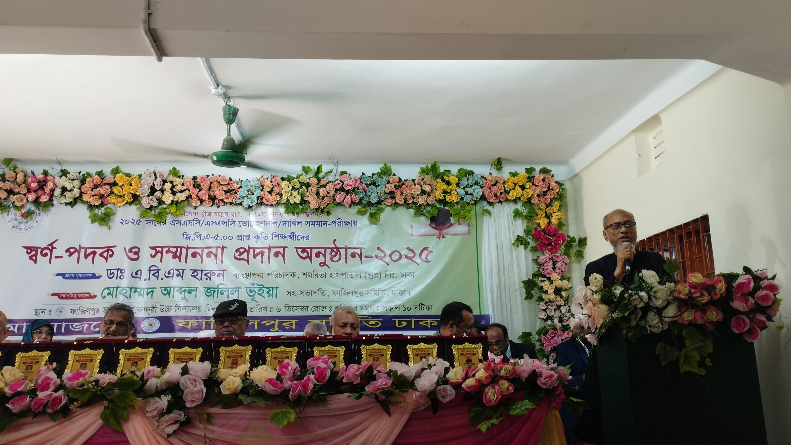 এসএসসি/ এসএসসি ভোকেশনাল/ দাখিল সমমান পরীক্ষায় জিপিএ-৫ প্রাপ্ত কৃতি শিক্ষার্থীদের স্বর্ণ-পদক ও সম্মাননা প্রদান অনুষ্ঠানের আয়োজন করে ঢাকাস্থ ফাজিলপুর সমিতি। ৬ ডিসেম্বর ২০২৫ রোজ শনিবার সকাল ১১টায় ফাজিলপুর ডব্লিউ বি কাদরী উচ্চ বিদ্যালয় মিলনায়তনে অনুষ্ঠিত হয়।